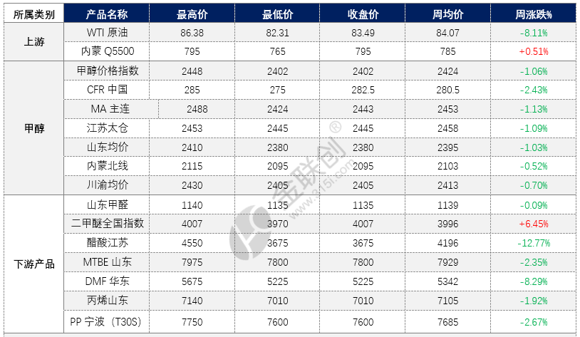 数据来源:金联创 节后国内甲醇市场整体表现偏弱,多地重心走低,阶段内原油、宏观等因素对市场影响较大。截至12日15时,中国甲醇价格指数2402,较节前落41点。假期间原油大跌、周内商品同步回落等影响业者操作心态,市场交投气氛较差,甲醇贸易转单及工厂价格均有下滑;然宁夏、乌海一带受区内部分装置检修/临停,加上新疆一带偏强需求提振,该地重心有走高,上周内两地套利开启。港口期现联动走弱,节后港口基差表现走强。 2 本周市场关注点 继续关注国内外宏观政策等影响;另原油等走势变化待关注。 近期煤价略有松动,大秦线检修影响不及预期,加上近期下游等拉运积极性减弱;然国内安监等持续,继续关注煤炭市场变化。 后续部分装置重启下,甲醇开工或将走高,然西北产区等亏损下,关注成本利润对企业开工的影响。 上周市场交投较弱,关注上游企业库存变化;目前像鲁北下游等原料库存偏高,闻局部压车,整体采购积极性偏弱。 3 本周市场展望 甲醇展望:节后国内甲醇市场表现偏弱,宏观、外围等持续对市场作用。后半周煤炭略有走弱,关注成本端支撑情况;另基本面来看,后续计划检修甲醇装置不多,且随着部分装置重启,甲醇供应仍显多,下游端,闻山东等地下游局部有压车,整体原料库存偏中高,故基本面表现偏弱,预计后续内地甲醇市场延续偏弱整理,继续关注煤炭、宏观、期货、企业开工变化等。港口或多维持期现联动,商品偏弱或继续联动影响,然海外后续限气等导致到港预期缩量,故预计短期港口基差或表现相对偏强。 甲醛展望:原材料甲醇上周稍有回调,甲醛成本支撑减弱,叠加近期大宗商品行情集体走低,进而有可能影响甲醛价格继续回落。预计本周甲醛市场震荡走弱,局部地区跟随下跌概率较大。 醋酸展望:陕西延长醋酸装置停车,但听闻时间不长,对市场影响有限。行业整体开工率仍处于高位水平,且上周内醋酸价格跌势过快,增加下游观望情绪,因此去库存效果不佳。华鲁恒升荆州装置即将出产品,但下游PTA和醋酸酯等开工一般。供需矛盾明显,以及业者对后市普遍持看跌心态,合约贸易商本月合约量多未销售完毕,预计本周醋酸价格继续下行。 DMF展望:预计本周国内DMF市场偏强震荡。供应方面,河南骏化、安徽金禾化工维持停车中,华鲁三期新产能或有投产计划,其他工厂装置较为稳定,供应或有增加预期。需求方面,目前DMF库存水平不算高,订单存一定跟进,加之月底DMF有工厂存检修计划,陆续或有累库情况,价格暂无下跌预期,但终端市场并不旺盛,且有新产能投产计划,整体来看涨幅也有限制,下游多刚需适量补仓,整体需求仍待释放;市场心态方面,下游补货或有小幅好转,但受供应增加和终端疲软影响,整体心态难大好。 丙烯展望:基本面整体走空,预计短期丙烯市场或延续下行。供应面,淄博某PDH装置计划重启,场内丙烯流通量或有所回升,供应压力预期增加。需求面上,聚丙烯期货现偏弱震荡,粉料盈利能力不太乐观,加上聚丙烯及其终端行业转入淡季,下游开工及采购热情预期走弱;化工下游方面,齐翔、齐鲁下游检修装置继续停车,化工下游盈利整体尚可,随行就市跟进为主。展望后市,丙烯市场成本面支撑坚挺,供需面整体偏空,金联创预计短期丙烯市场偏弱下行,建议密切关注聚丙烯期现货行情及丙烯检修装置动态等。 PP粒料展望:供应面来看,近期石化整体检修偏少,石化库存同比累积增加,供应面压力较节前增大。需求面来看,近期下游需求较前期整体转弱,加之原料价格低走,制品定价难以维持,预计新订单降价为主,工厂刚需采购,成交一般。终端厂家恐跌情绪升温,下游厂家定价能力减弱,业者信心不足。但成本支撑仍在,现货升水期货报盘,行情或有转折,预计近期PP价格小幅反弹。 如欲转载本文章,请注明内容来源于金联创 |